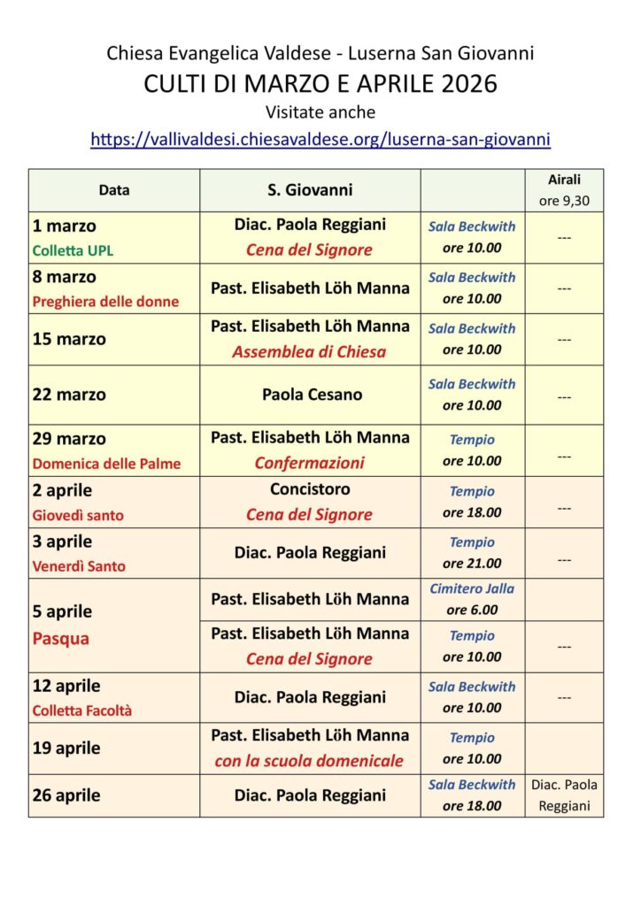 Calendario dei culti per i mesi di gennaio e febbraio 2026