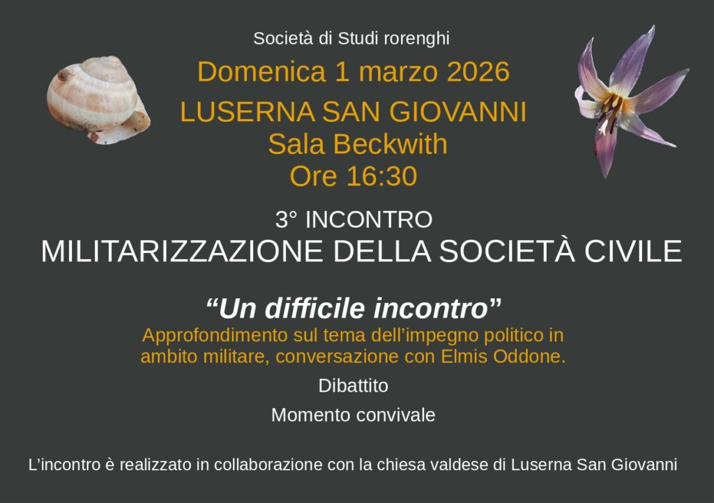 Nell’ambito degli incontri organizzati dalla Società di studi rorenghi sulla “Militarizzazione della società civile”, alle ore 16.30 presso la Sala Beckwith (via Beckwith, 50, Luserna San Giovanni), in collaborazione con la Chiesa valdese di Luserna San Giovanni: