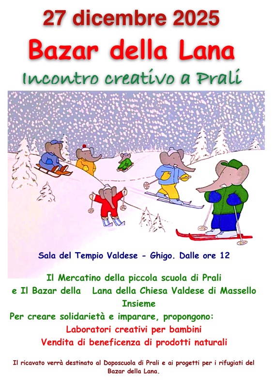 Il mercatino della Piccola scuola di Prali e il bazar della lana della chiesa valdese di Massello organizzano sabato 27 dicembre “Insieme per creare solidarietà e imparare”, laboratori creativi per bambini e vendita di beneficenza di prodotti a beneficio del doposcuola di Prali e del progetto per i rifugiati promosso dal bazar della lana.