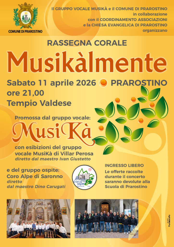 All’interno della rassegna corale “Musikalmente”, sabato 11 aprile a Prarostino concerto del coro Musikà di Villar Perosa diretto dal maestro Ivan Giustetto e il coro Alpe di Saronno, diretto dal maestro Dino Carugati.