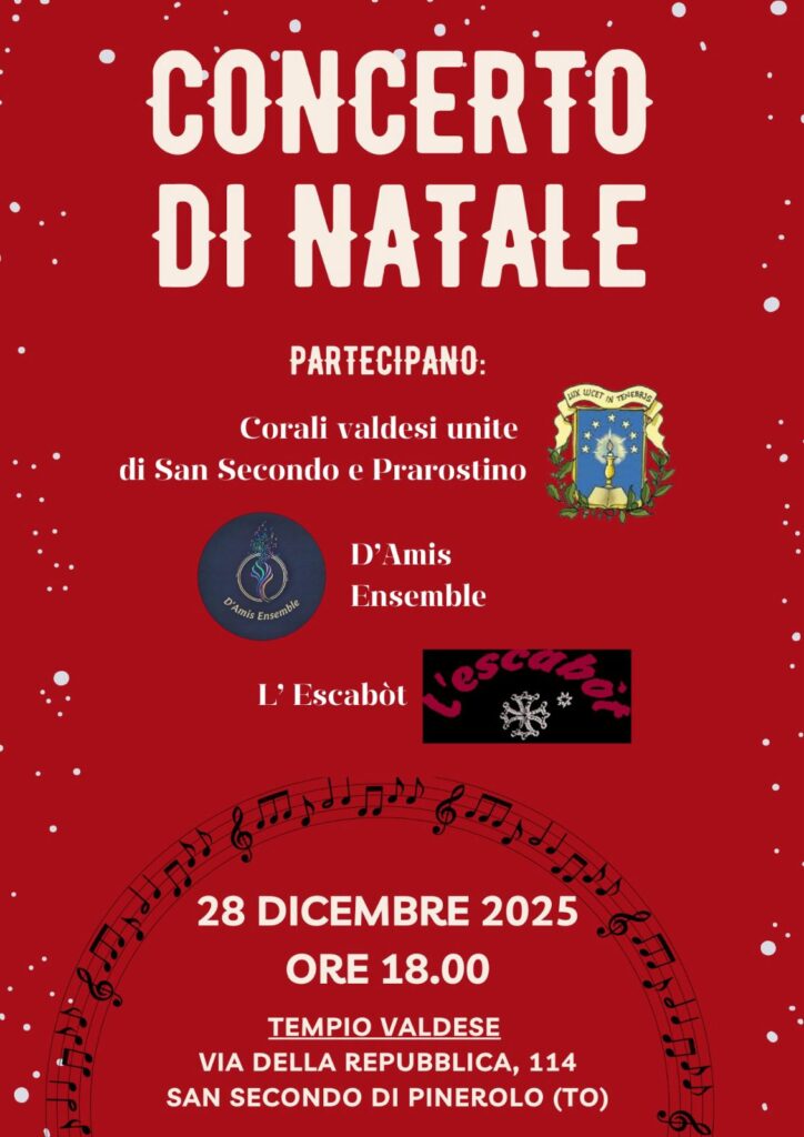 Domenica 28 dicembre concerto delle corali riunite delle chiese valdesi di San Secondo e Prarostino con il gruppo musicale “Escabot” e del quartetto “D’amis ensembles”.