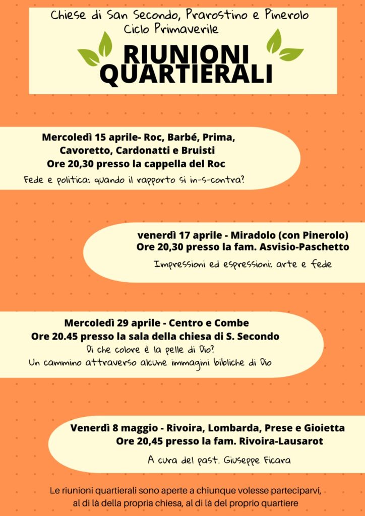 Riprendono le riunioni quartierali del ciclo di primavera: quattro date, quattro luoghi e quattro temi diversi… per le chiese valdesi di Prarostino e San Secondo, aperte a chiunque volesse anche sconfinare oltre il proprio quartiere.