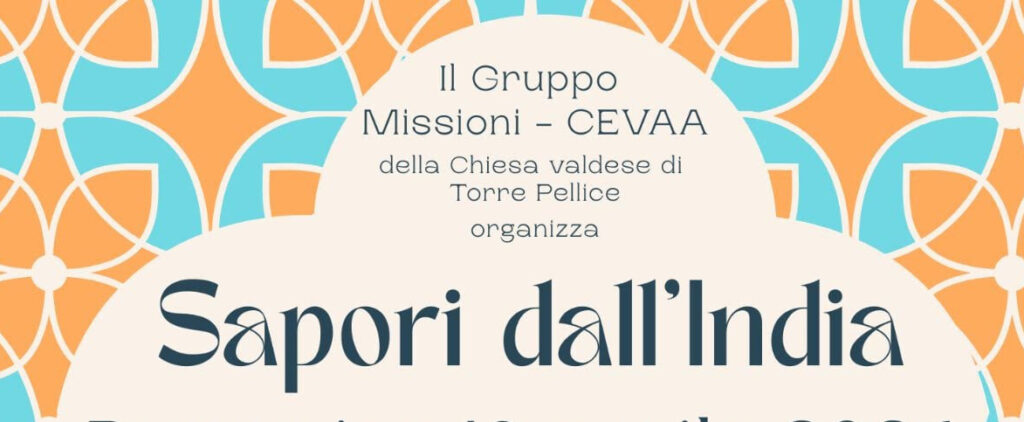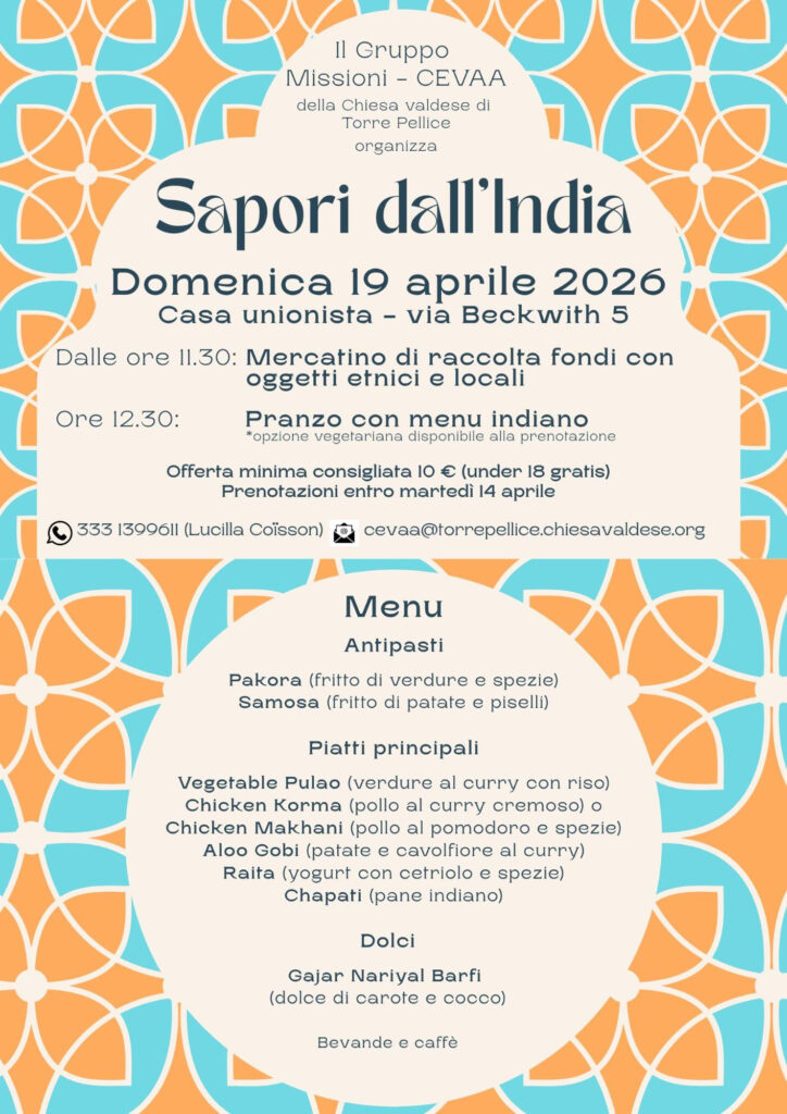 La chiesa valdese di Torre Pellice e il Gruppo Missioni – CEVAA organizzano per domenica 19 aprile, dopo il culto con assemblea di chiesa, l’iniziativa “Sapori dall’India”, alla casa unionista in via Beckwith 5.