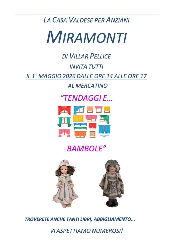 Venerdì 1 maggio la casa valdese per anziani Miramonti di Villar Pellice invita al tradizionale mercatino: si potranno trovare tendaggi, bambole, libri, abbigliamento.