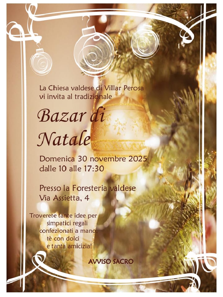Domenica 30 novembre la chiesa valdese di Villar Perosa invita al tradizionale Bazar di Natale.
