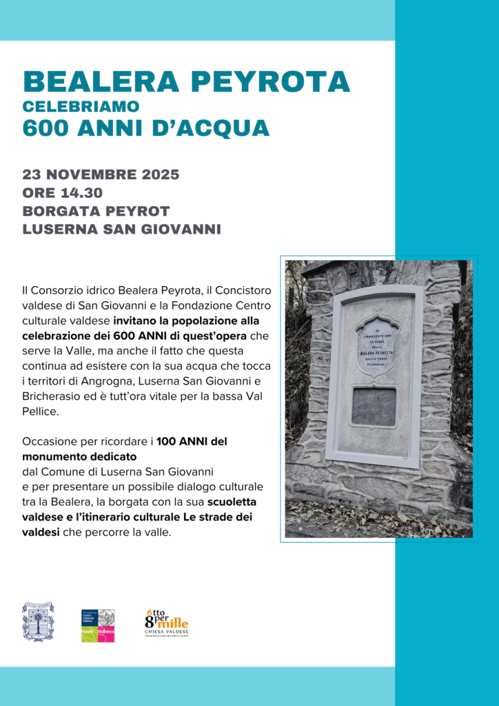 Il Consorzio idrico Bealera Peyrota, il Concistoro valdese di San Giovanni e la Fondazione Centro culturale valdese invitano la popolazione a partecipare al momento di celebrazioni che si terrà il 23 novembre prossimo a partire dalle 14,30 alla borgata Peyrot per i Seicento anni della Bealera Peyrota.