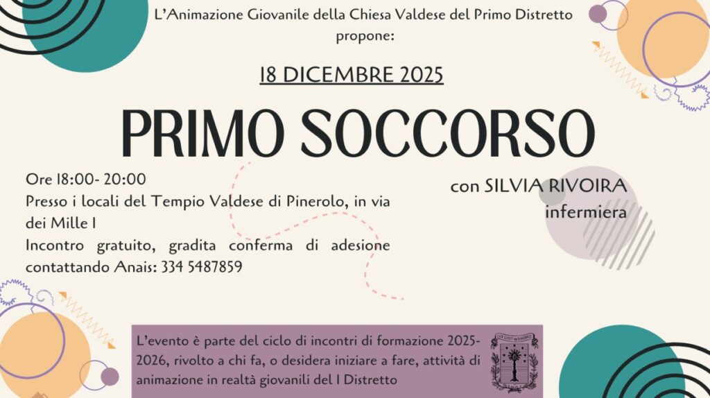 Giovedì 18 dicembre l’Animazione giovanile delle chiese valdesi del I distretto organizza un momento di formazione su “Primo Soccorso”, con l’infermiera Silvia Rivoira.